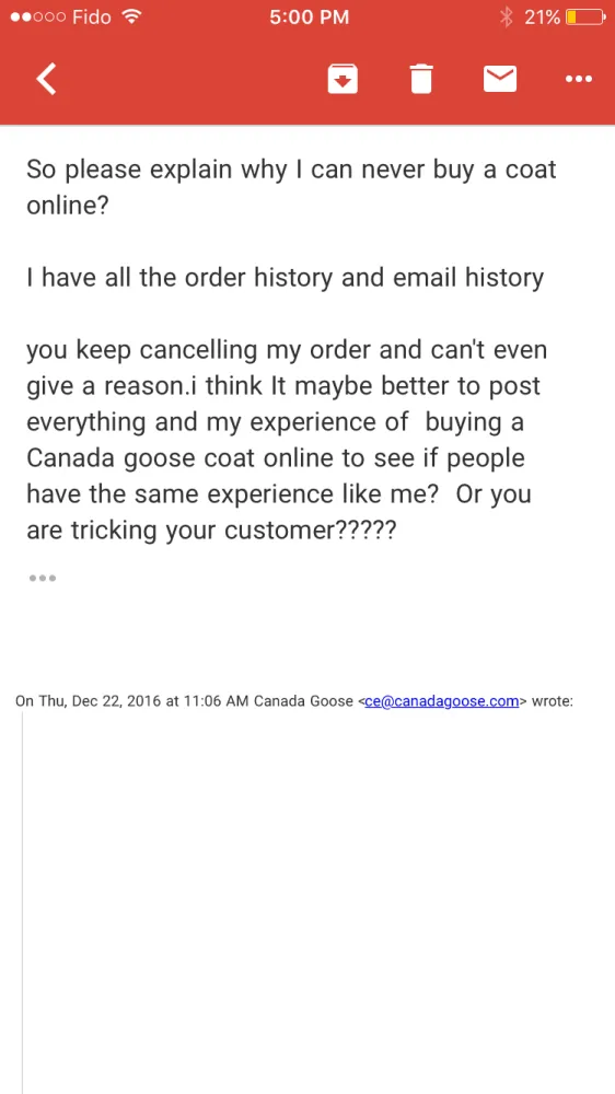 I placed seven orders online and Canada goose cancelled my order seven times.