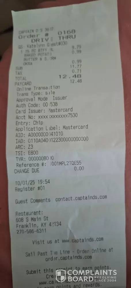 Last night I went to the Captain D's in Franklin, Ky. I ordered the 15pc butterfly shrimp dinner. I don't live but about 5 miles from the restaurant & couldn't wait to get home & eat. It was the worst food I have eaten in a long time. It wasn't hot, tasted awful, only 12 shrimp but I ended up throwing away over 1/2 my order in the garbage anyway so I guess it didn't matter there was not 15. I ate 2 bites of my baked potato; 1 hushpuppy, 5 shrimp & about 6 pieces of my okra. Everything else went in the garbage. I wouldn't even put in the fridge for later or give it to my dog. That was the 1st & last time I will go to Captain D's.