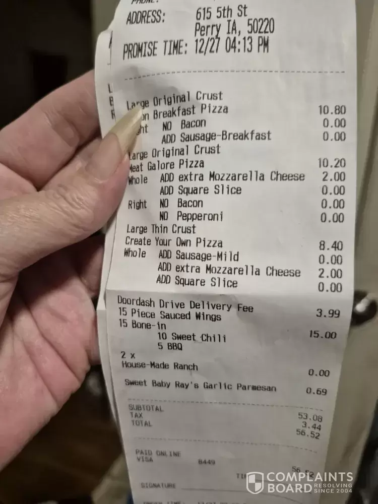 Placed a order Saturday the 27th, 2025. Early after noon then received call they were out of wings due to truck running behind. I said okay understand. After 10 minutes of discussion first manager very nice. Helped cancel so then I would reorder later so we could get the wings and a thin crust pizza. Took a few times placed order. One of the pizza was suppose to be a thin crust mild sausage pizza it came Italian sausage. My grand daughter can not handle Italian needed mild.