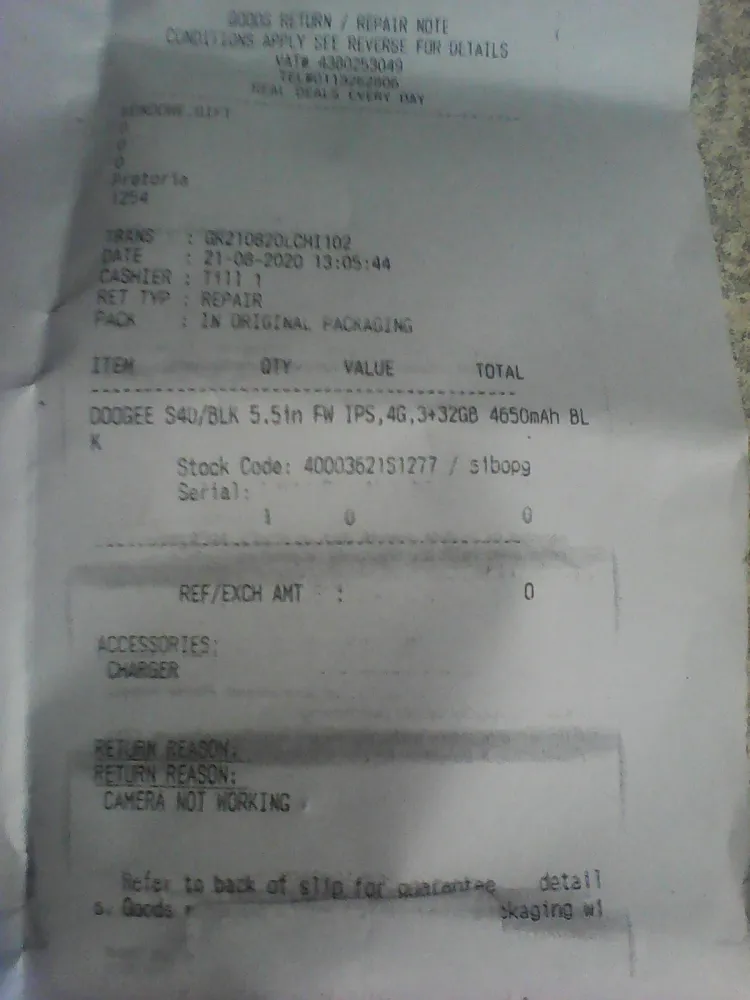 I sold a dooggee s40 at the randburg branch on the 15th of august 2020 which was faulty. The sales rep did not inform me at all that the phone was faulty. The only thing that he showed me was how to insert the sim card and sdcard, the phone was not from the box but taken from the the display. It also had a battery life percentage of 80% which I couldn't understand for a brand new phone why would the battery be at such a percentage. My concern is that I returned the phone within their seven day warrantee policy hoping to be refunded or given a new device. But to my surprise I was told it was to be taken to the head office for a report to assess if I damaged it.