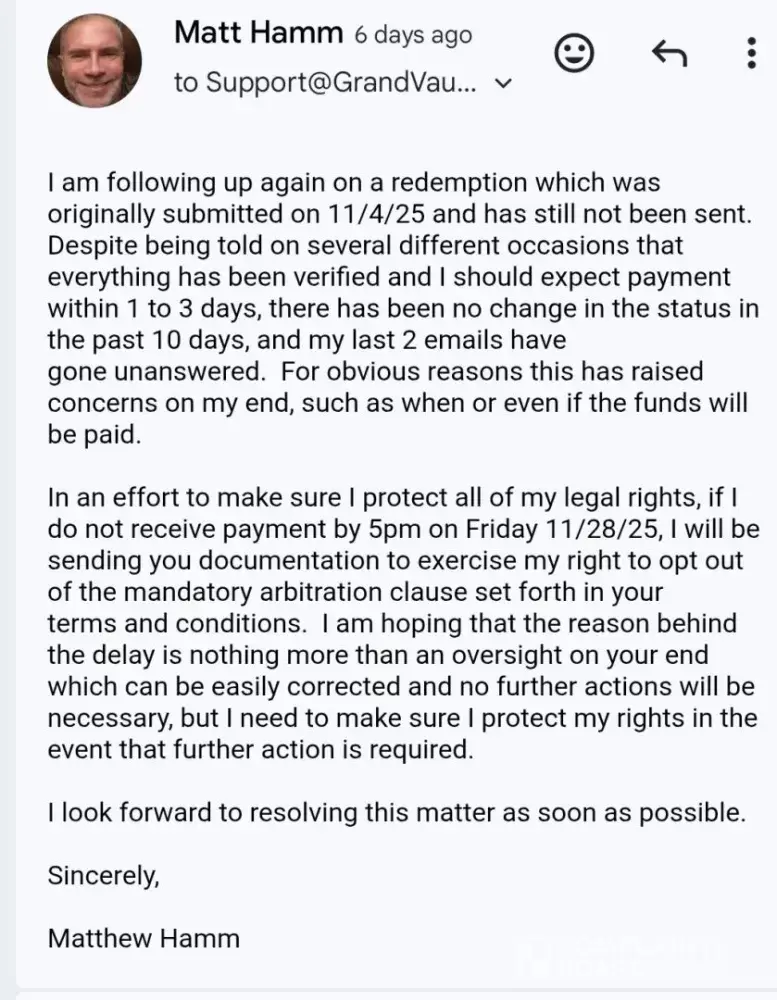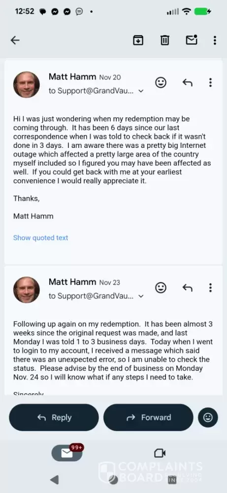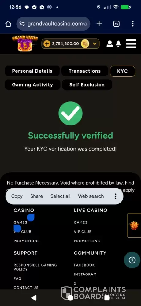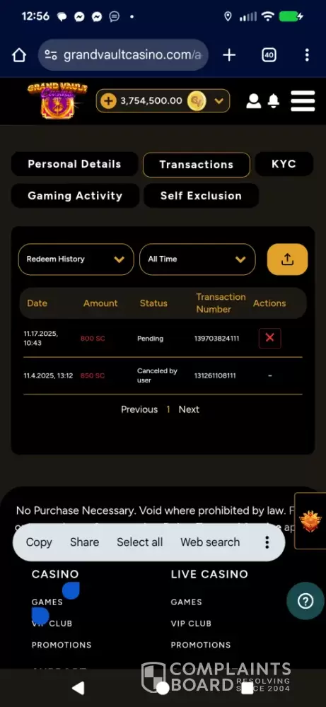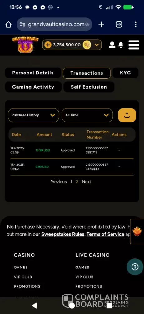 I became a registered user at the Grand Vault Casino on [protected], which operates as a sweeps casino. I purchased one of their Gold Coin Packages which provides the player with a large amount of gold coins, which can be used for recreational play only. The gold coins are basically worthless as they cannot be redeemed and have no monetary value, for someone...