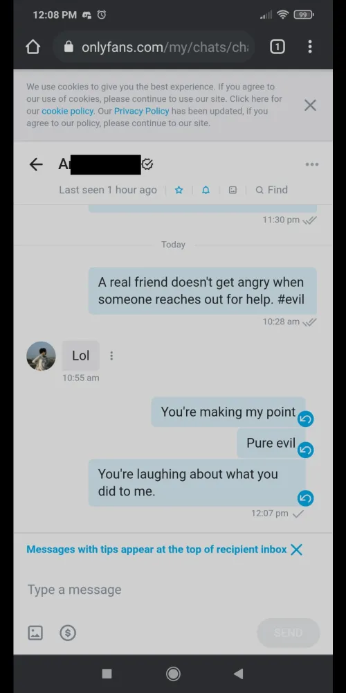 Unfortunately, this wasn't the end of it. About two weeks later, on February 18, I sent her a message to through her Only Fans page in which I graciously forgave her, despite never receiving an apology or any acknowledgement of the suffering she caused me. She responded by mocking me, simply repeating the first sentence of my message. I then told her that a real friend doesn't get angry when someone reaches out for help. Her response: "lol." I ask you, does this sound like the behavior of someone that simply misunderstood something? Her mindset and lack of remorse seems clear to me.