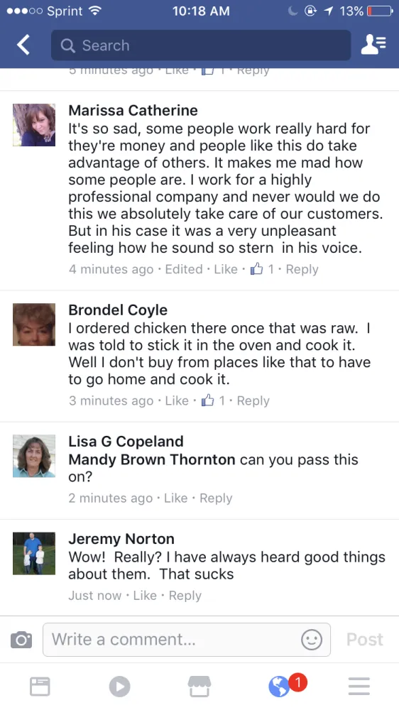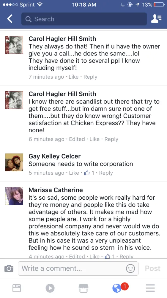 Of yesterday. I kindly asked her to remove the post she about my minor son she has not so I am forced to take action . No one will call me back from the office of chicken express something needs to be done about this woman she is causing things for my child that is a minor problems at school and for her to post his picture on a buy sell trade site and say she is the general manger is just out rageous. If she had an issue with my son she should of contacted me his mother. My name is Jodie Murray I can be contacted at [protected]