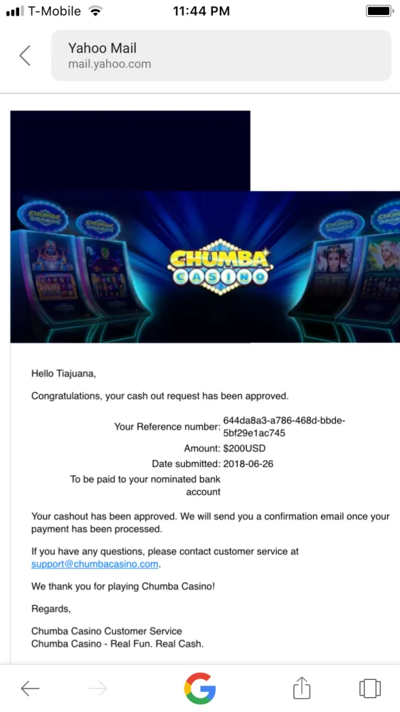 Chumba cash is not being loyal on paying out. they don't mind taking money from you. but when you win and you submit everything that you need to submit they don't want to pay out. I know I shouldn't Gamble but also chumba cash should not be taking people's money and not paying them. they used to have good customer service.