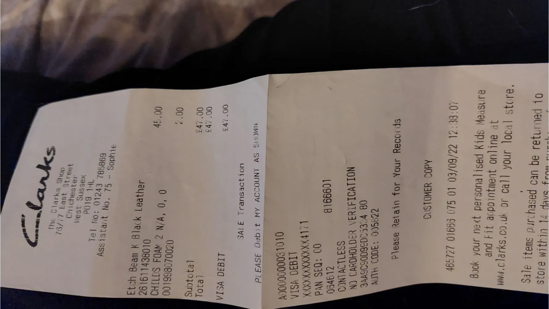 Went into your chichester branch on sat 3rd sept with my daughter to get her feet measured and to find some school shoes she was measured as a 1E the assistant then went to get a selection of shoes in her size and width my daughter tried them on and found the ones she wanted slightly bigger to give space so got insoles to cover for that so we paid and left my daughter wore her shoes to school on Monday as planned and Tuesday and was complaining about how tight she had to do the velcro strap i have checked the shoes today by taking the insoles out and have found that the shoes width is a H when my daughter is only an E but i now cannot take the shoes back as she has worn then and im not prepared to pay out another £45 for a new pair when its the mistake of the store and my daughter is now left with shoes she has to pull to tight to get them to stay in place properly. The time of purchase was 12:38 on the 03/09/22