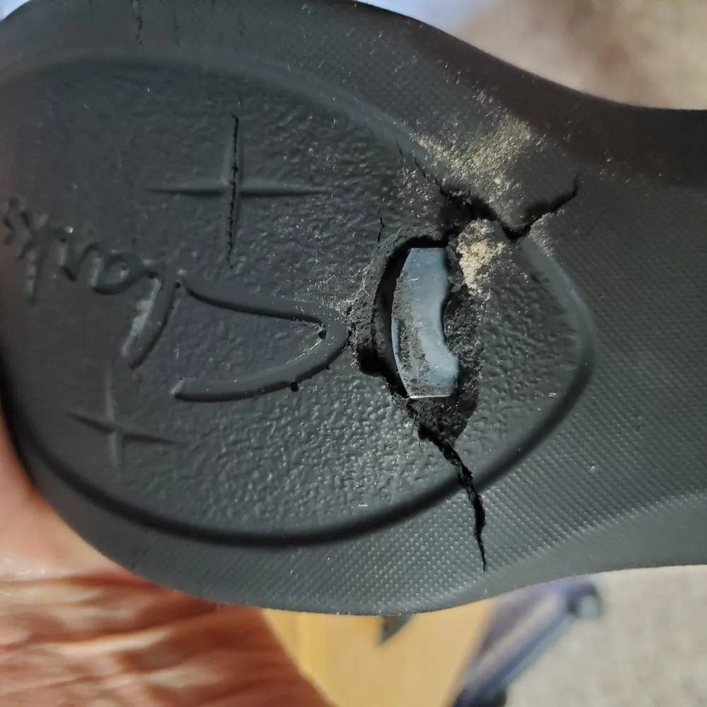 I bought a pair of Clarks shoes.They were brand new and looked perfect.I put my right foot in the right shoe.Then I turned to watch the tv for about 5 minutes. Then I went to put on the left and saw the shoe on my right foot had completely fallen apart.I couldn't believe it, bits of rubber on the floor, uppers split open, sole broken into cracked pieces and also, a lot of dust and debris was inside the shoe and it looked like there were areas of wear inside the toe section.