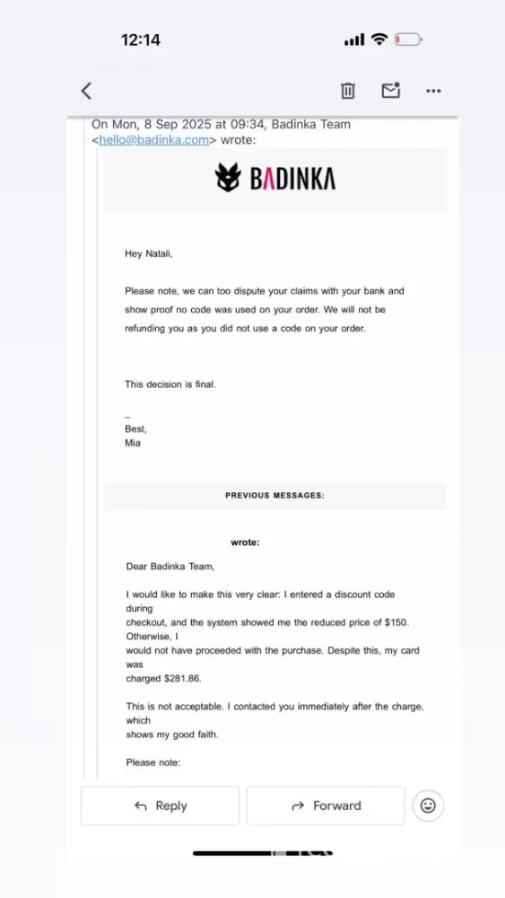 I ordered from Badinka using their promotion code. At checkout my total was $126, but my credit card was charged $281. I contacted them multiple times by email, but they refused to refund or correct the mistake. This shows a clear pattern of fraud. I have already filed a fraud complaint with my bank. In addition, Badinka deletes negative reviews on...