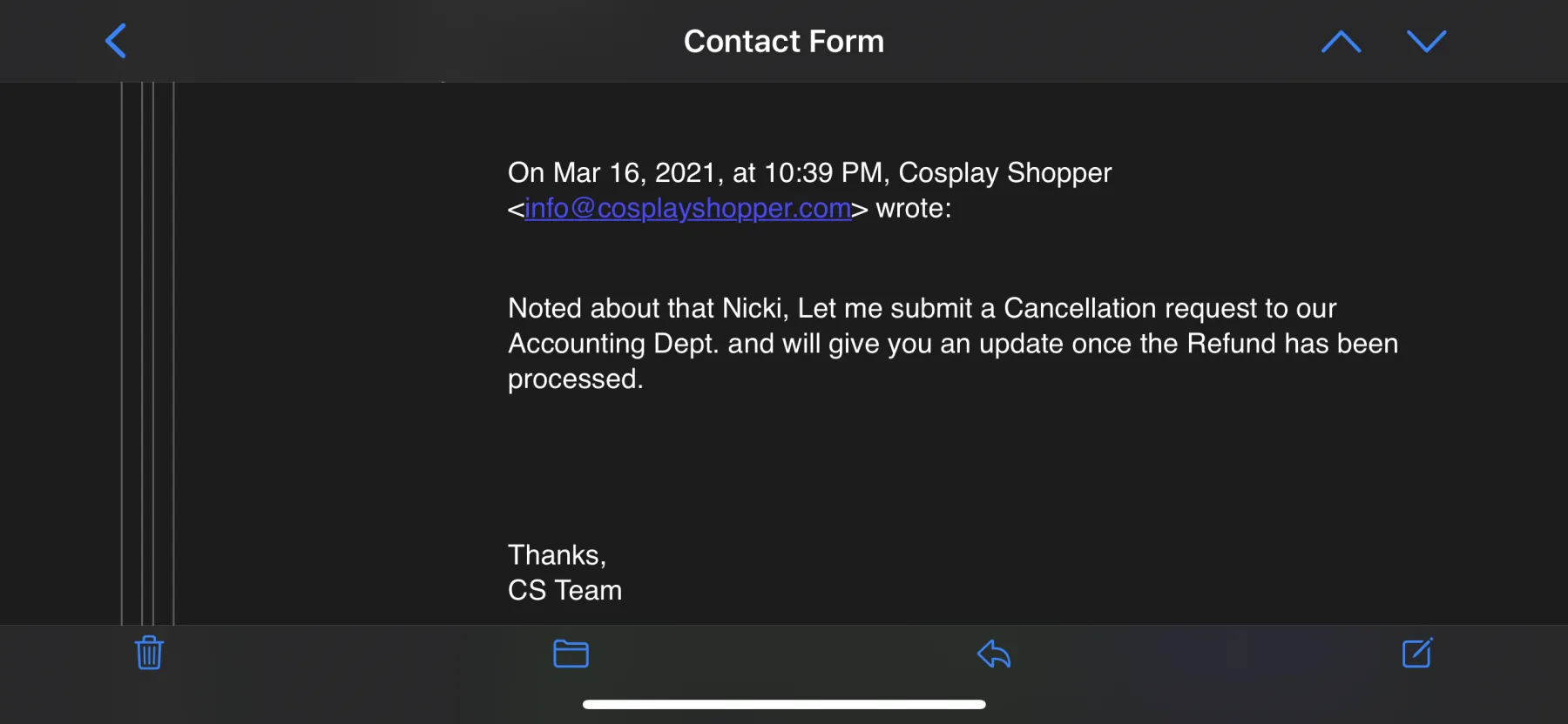 DO NOT TRUST THEM! I tried to order a $142.97 ($162.45 including shipping) cosplay from them on April 16th, 2020. I got an email saying it was shipped and all, but it was a Chinese site. So I waited a few months since it seemed like it was being shipped from out the country. However, nothing came. In March 2021, I tried reaching out to them and never heard anything. It was only when I started posting negative reviews and telling my story on sites they reached out. I gave them the order details and they said that “the order was out of stock for the product and they were never able to process my order”. In other words, they took my money and sent my a bogus teaching number then. They said that they would cancel the order (so they had it the whole time?) and would refund me through PayPal. Surprise, it’s October 2021 and I still haven’t been refunded for a product I paid for and never got. AVOID AT ALL COSTS!