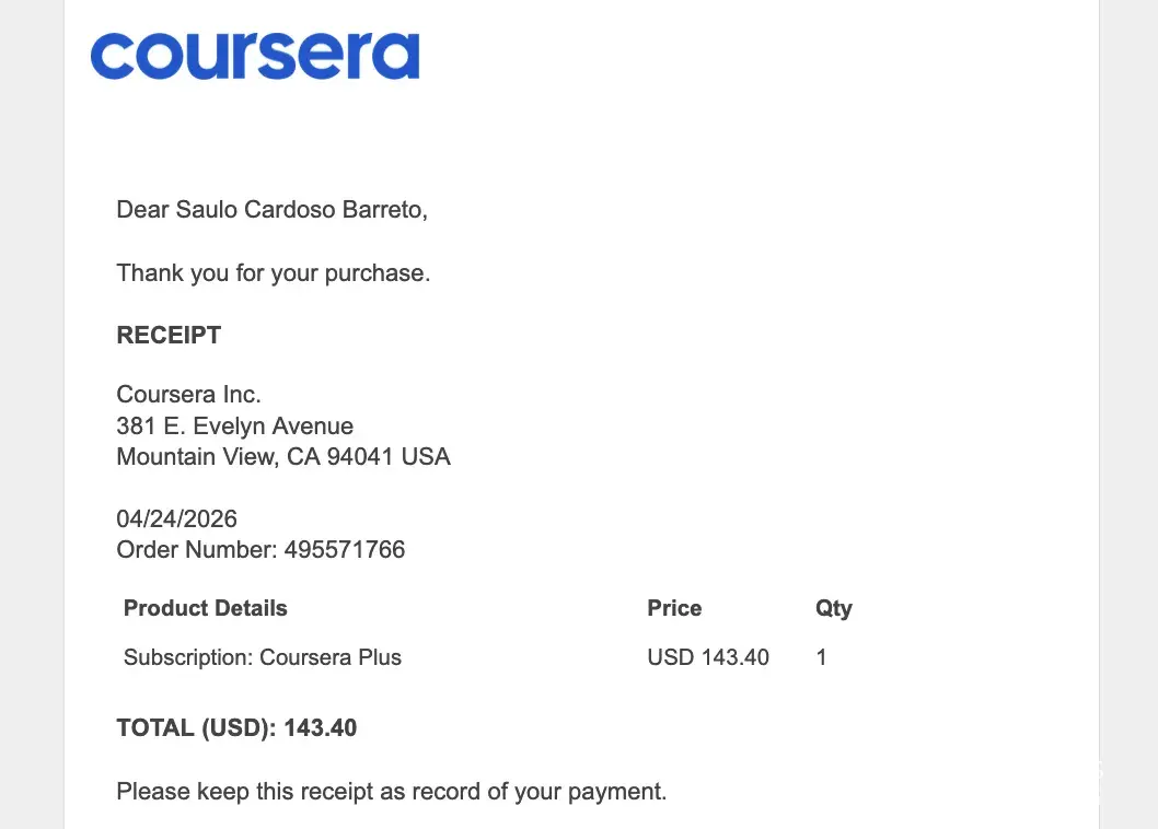 On April 24, 2025, I purchased a Coursera Plus Annual subscription under my account. Coursera's own published policy guarantees a full refund if you cancel within 14 days of purchase. I requested my refund within 2 days, well inside that window.