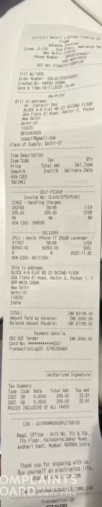 I booked the iPhone 17 through Croma's Vasant Kunj. New Delhi store (Ambience mall) on 19th Nov 2025 with a pre-booking amount of Rs.2,000 with the assurance that once the device arrives in-store, I will receive an instant cashback of Rs.6,000 through ICICI bank card. On 22nd November, Apple announced that they will be reducing the discount amount for phones ordered through their website post 22nd November (Source of news: https://www.moneycontrol.com/news/business/indian-buyers-hit-as-apple-slashes-iphone-17-cashback-offer-amid-major-supply-crunch-in-india-13690676.html)