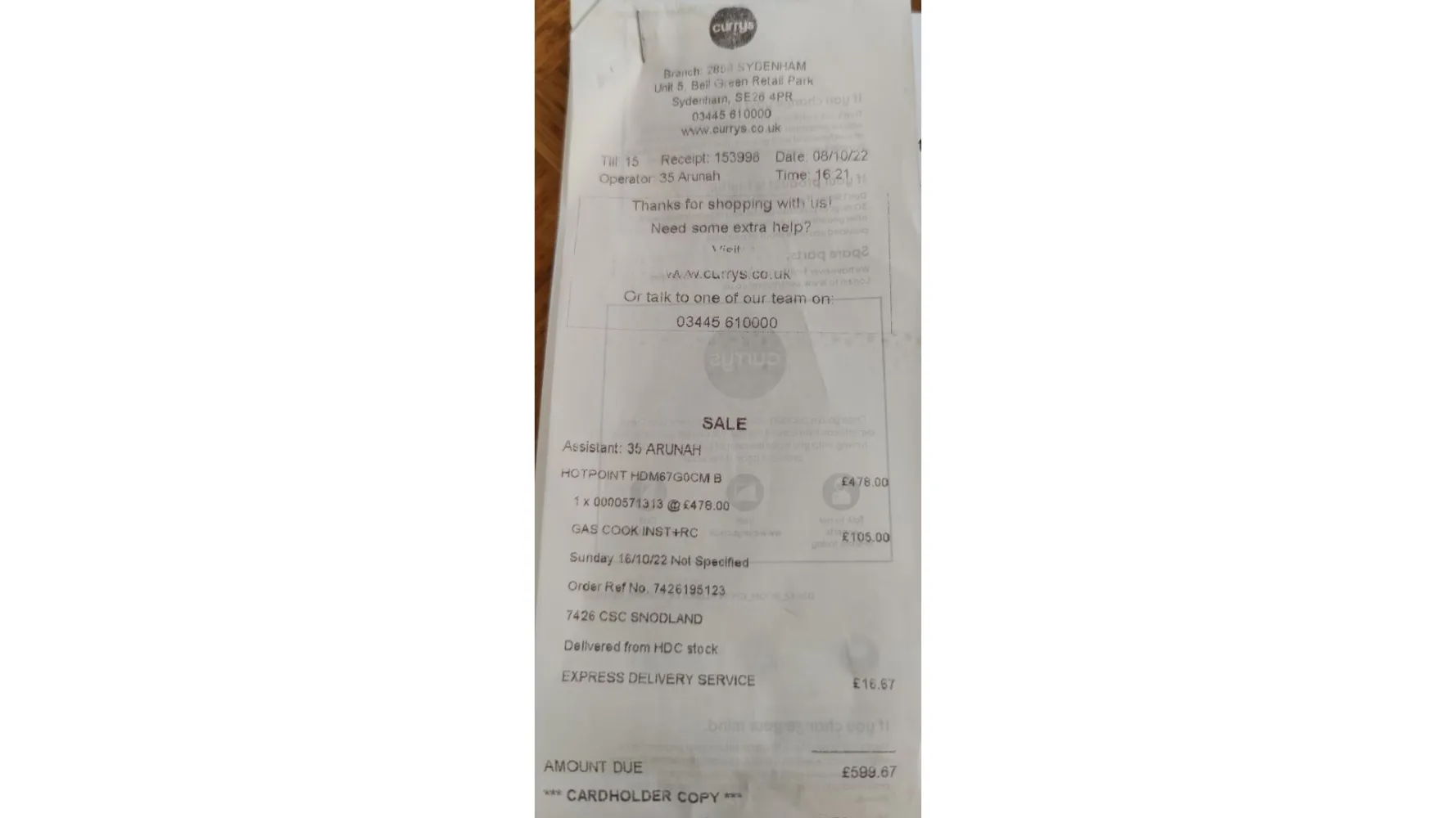 I ordered a [protected] HOTPOINT HDM6G0CM B oven from Currys Sydenham on 8th October 2022.