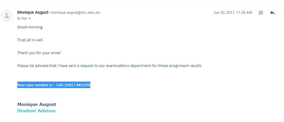 Dear student, trust that you are well. Please be advised that your matter is under investigation. Please e-mail customercare@dcc.edu.za together with your student number.