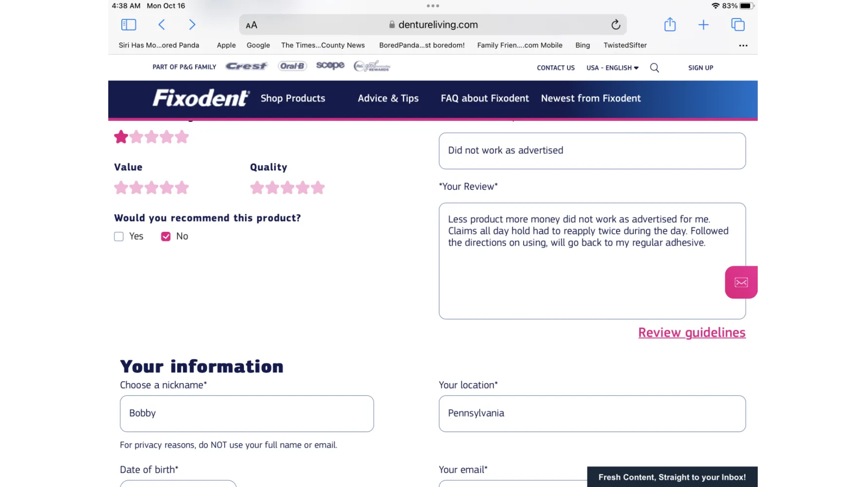 I am a denture wearer and I purchased your professional fixodent based on your claims. First off I had to reapply twice during the day, there is less product,cost more money and for me did not work as my regular adhesive. I tried to leave a review on your website and I could not submit it,all the fields were filled in.