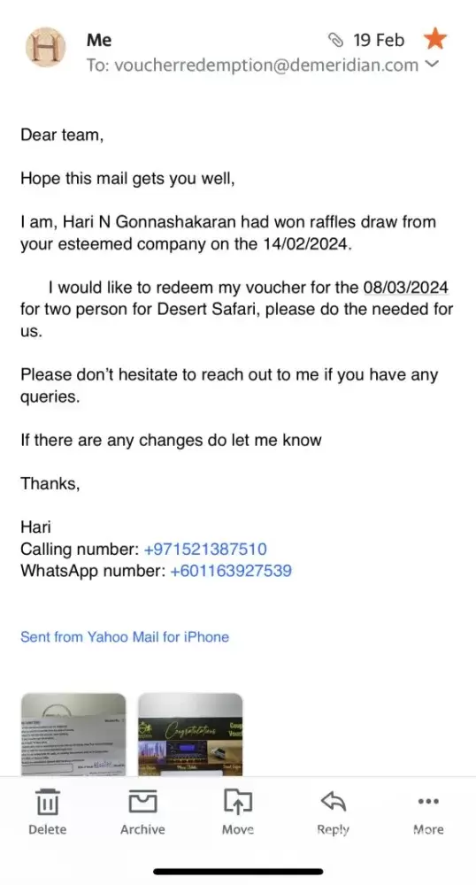 I had attached all photos of your perusal, I had already sent email for the redemption of the voucher number 5047 which was given by Hazel your sales person, it’s says that I have to book in prior of 14 days how ever I placed my booking before 18days and till now only one reply came and still not very sure weather we will be going to the Dessert Safari on the 08/03/2024.