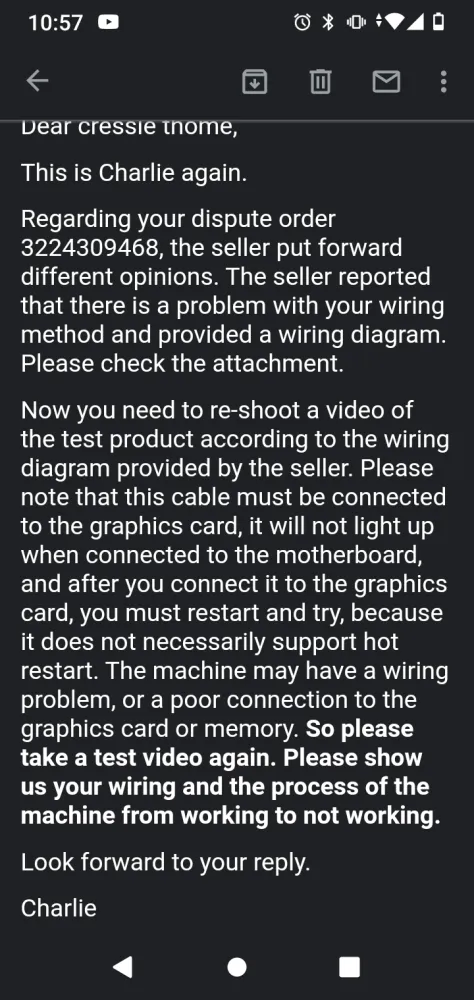 I have also contacted seller and he has offered 80USD refund but order was 142USD. The seller message is on your message centre and I also took screen shot and emailed to your customer support ID.