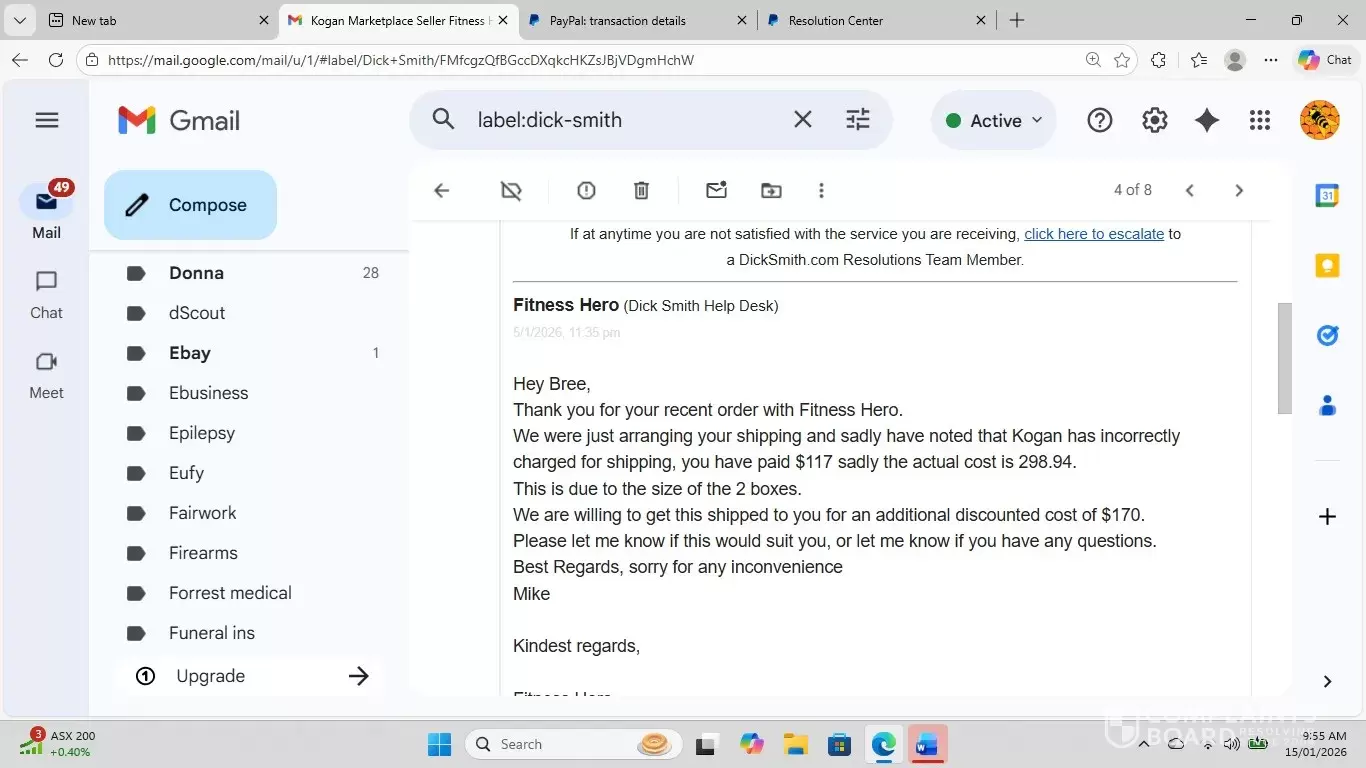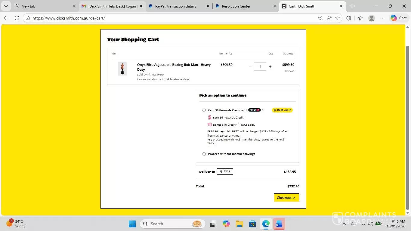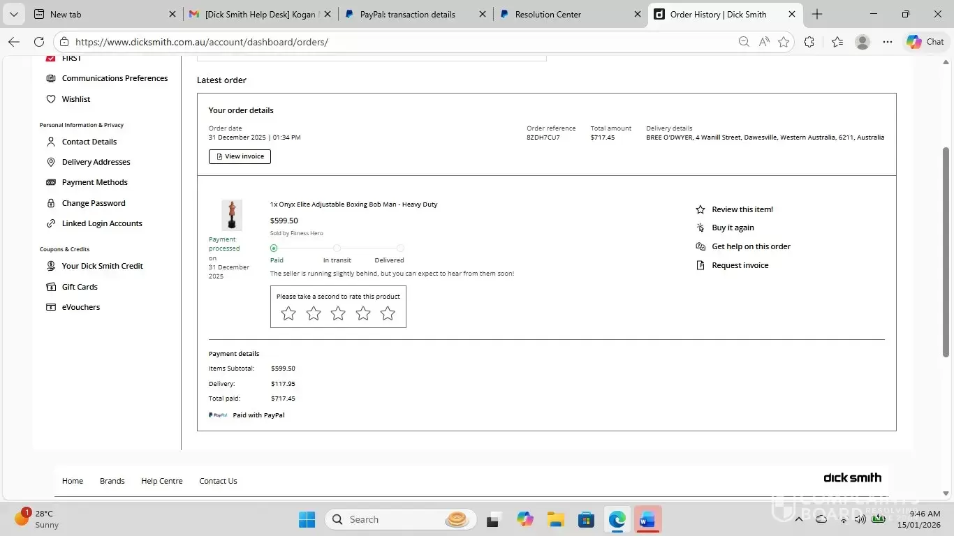 We purchased an Onyx boxing bob on 31st December 2025 with delivery expected 9-12 January 2026. We followed the tracking instructions and received a message that the item was delayed due to a train derailment. Followed up again through the website and were then advised that there was an error in the shipping price. We paid $117 shipped only to be told they...