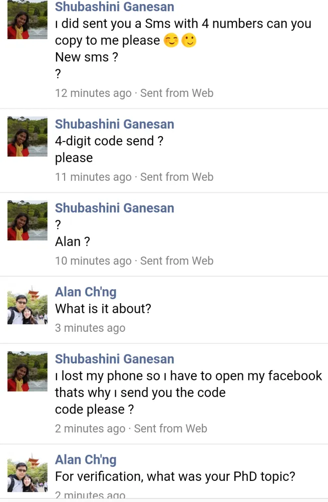 Fake facebook profile of friend asked for handphone number under pretext of wanting to talk.