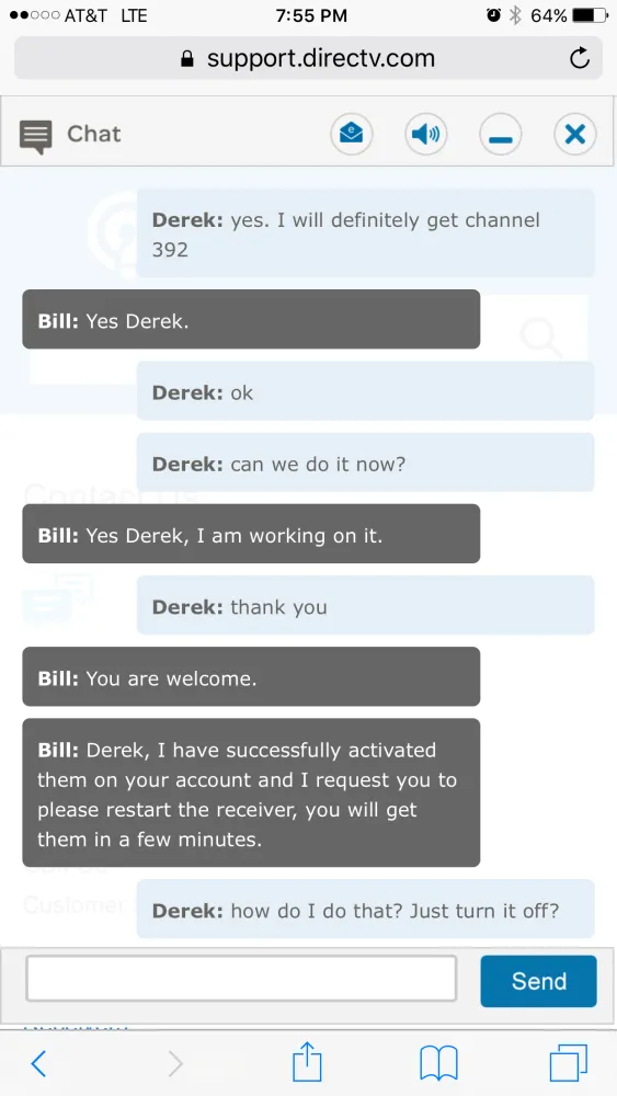 For the first time ever the NASCAR race was on a channel I do not get. Used the chat feature and was on chat for over an hour and they could not help or get me the channel. I then called in and kept getting transferred over and over to different agents who would ask the same questions and never help me out. I was eventually transferred to billing for some reason and finally got fed up and hung up after at this time a 2.5 hour saga. All I wanted was one channel!