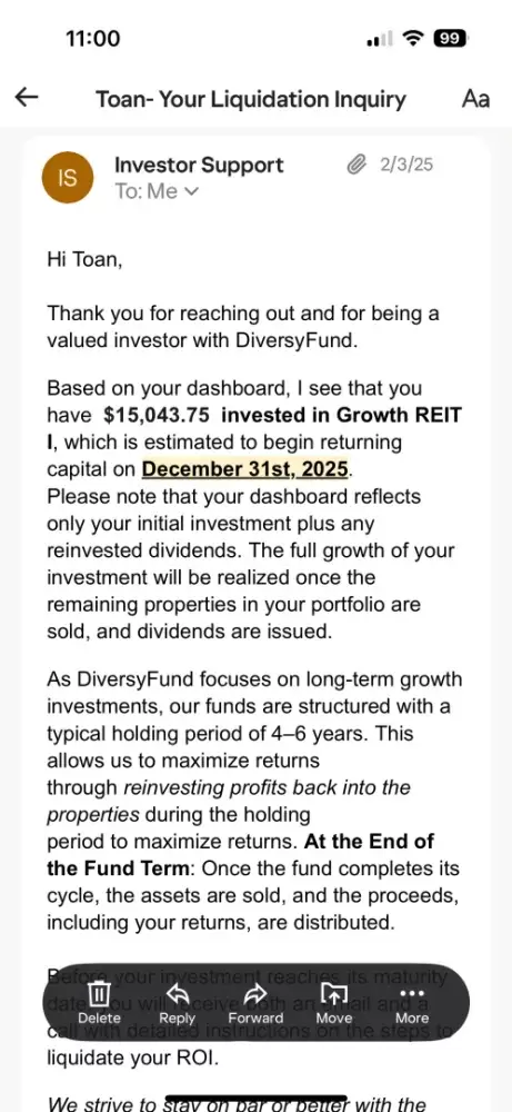 According to an email I received from customer support dated February 3, 2025, I was informed that my investment was scheduled to be liquidated no later than December 31, 2025. Based on this communication, I reasonably expected to receive either an update or the proceeds of the liquidation within that timeframe. However, despite multiple follow-up attempt...