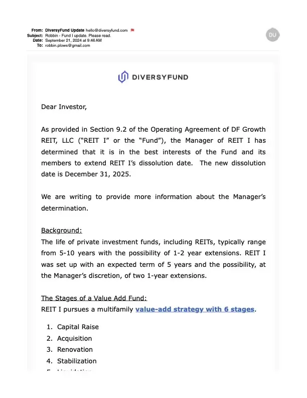 I initially invested in Reit I in July 2020. I understood that it was illiquid and I would not receive a return on my investment for 5 years. I stopped receiving fund updates in 2024, after receiving the attached letter. Since then, the investor portal has been static, not allowing me access to see how the fund is progressing and what stage it is in. I still receive emails urging me to invest more almost daily, but when I try to contact anyone at the company through the portal, it lands on an error page. I have reached out multiple times on the Diversyfund website and have not received any response. The telephone number listed for them is not working. I have also filed a complaint with the BBB and Diversyfund’s response was evasive and did not address my questions, but rather a canned response. This is unacceptable for any investor, accredited or not. I have been investing for many years and have never encountered this lack of communication before. I am also curious who their current registered agent is, since the last one I could find filed for resignation in February of 2025. I want to know why they are not responding or allowing access to our portfolios. If there is something amiss that affects the investors, this should be disclosed.