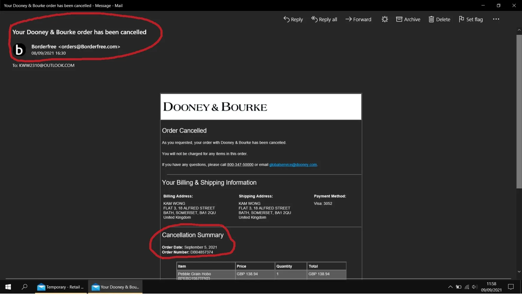 I then placed a 2nd order DB04857395 (BPEBC1957TPKR + BPEBC1956BMKR) only to find Customer Service had cancelled the BPEBC1957TPKR from 2nd Order DB04857395 instead of cancelling the 1st Order DB04857374 resulting in two outstanding Orders of DB04857374 + DB04857395. This is the main Customer Service mistake which lead to further issues.