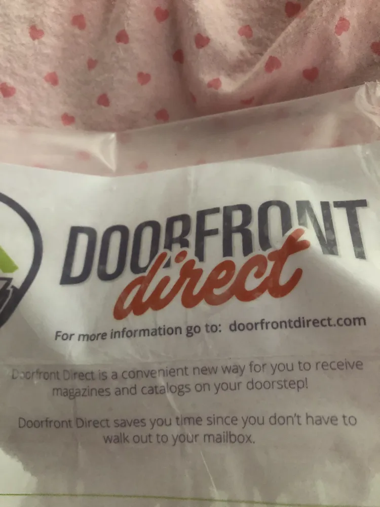 Doorfront direct is a brand name for the magazine delivery service run by Publishers Circulation Fulfillmemt Inc. (PCF Corp.) PCF Corp is a subsidiary of Gannett Publications and the CEO of PCF is Randall Brant based in Middletown, NY. I think they’re trying to undercut the postal service in terms of magazine delivery costs.