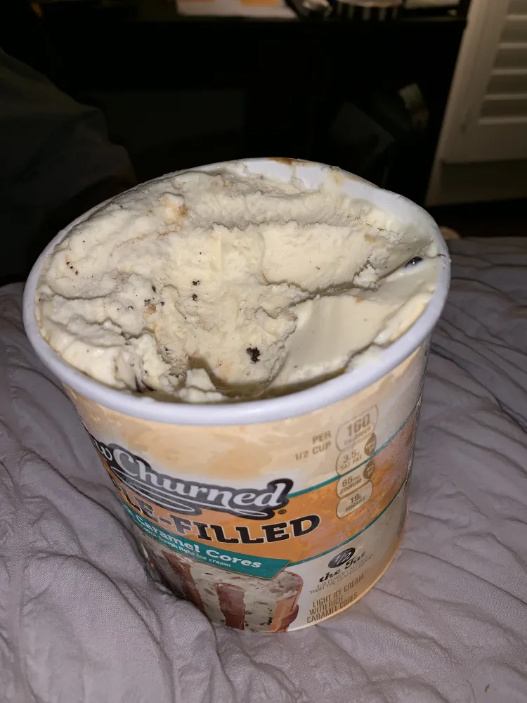 Unbelievable that there is absolutely barley any caramel. False advertising at its finest. I don't get ice cream that often and I was really excited until I opened it and found no caramel a few pieces of cookie dough and a ton of cheap chocolate chips. Even when I scooped a church out to see if there was any, just deeper down. And no! Obviously I can't return it. So i'm writing this complaint. That way you guys don't false advertise like this because it's unacceptable. Really really disappointed.
