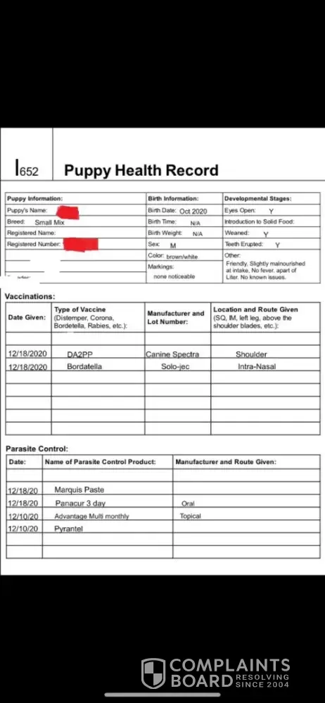 Company reuses the EXACT form I got in 2020 from East Dallas Pet Rescue (number 652) and whited out in the same areas TODAY. See mine attached. My dog from them was in NO WAY the breed mix described and came with an active flea infection, hookworms, tapeworms, giardia, and kennel cough. When I told them this, they asked how clean my house was!?