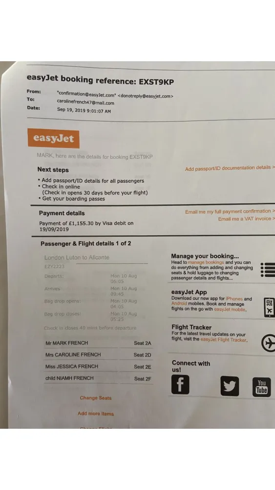 We originally booked flights from Luton to Alicanted on 19th September 2019 to fly in the following year in August 2020, we also paid and we wanted to pre-book our seats as Mrs French is disabled and needs extra leg room and an aisle seat. We therefore booked 2a, 2d, 2e and 2f and we also wanted x2 window seats.