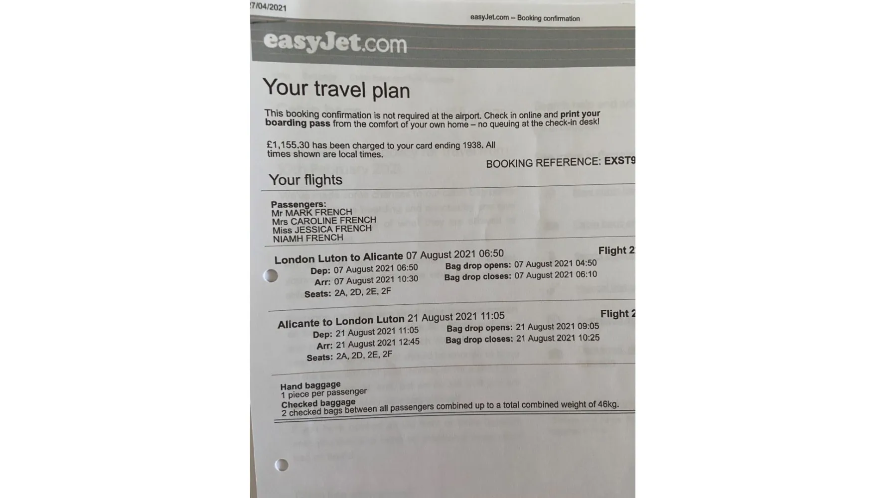 27-04-2021 travel plan = travel plan from easyjet showing seats 2A, 2D, 2E and 2F