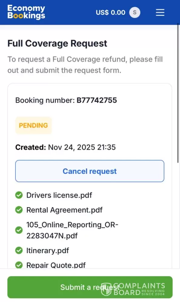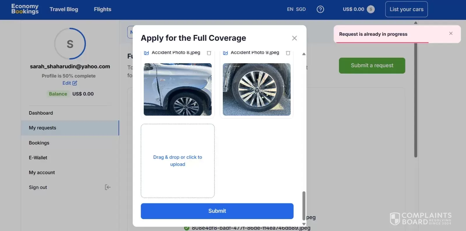 I replied to the emails given by the customer support team for my email and Whatsapp details but I still did not receive any reply. Please see attached the photo of the issue. Images display that the Full Coverage claim reimbursement in on PENDING status since 24th November and I am unable to create a new claim unless I cancel the previous claim. Please economg bookings provide an update to my email: sarah_shaharudin@yahoo.com
