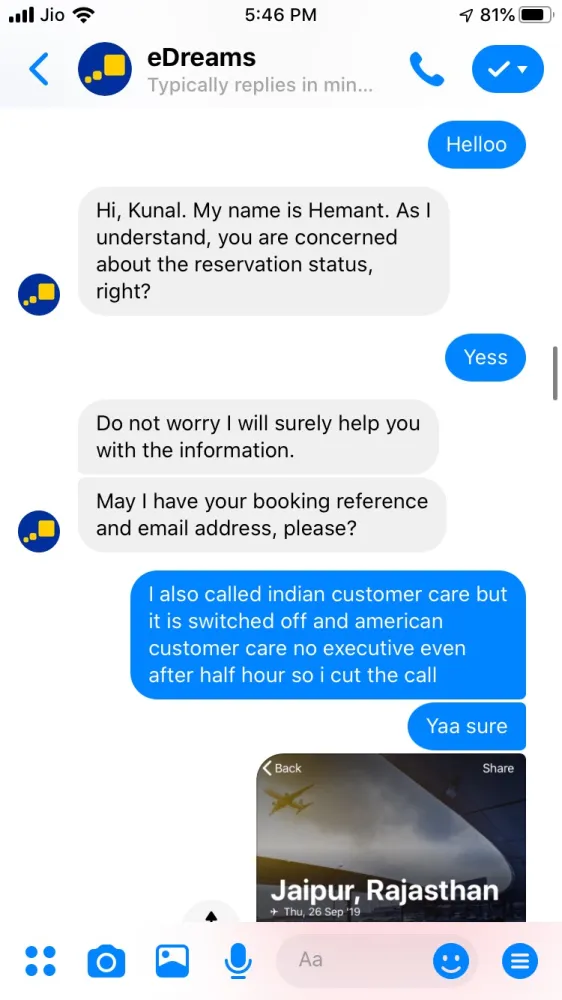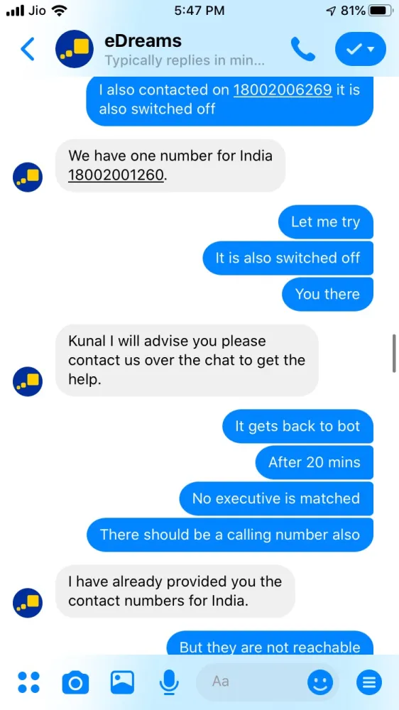 I then sent several emails to edreams to ask for contact to discuss I was unable to locate a number.