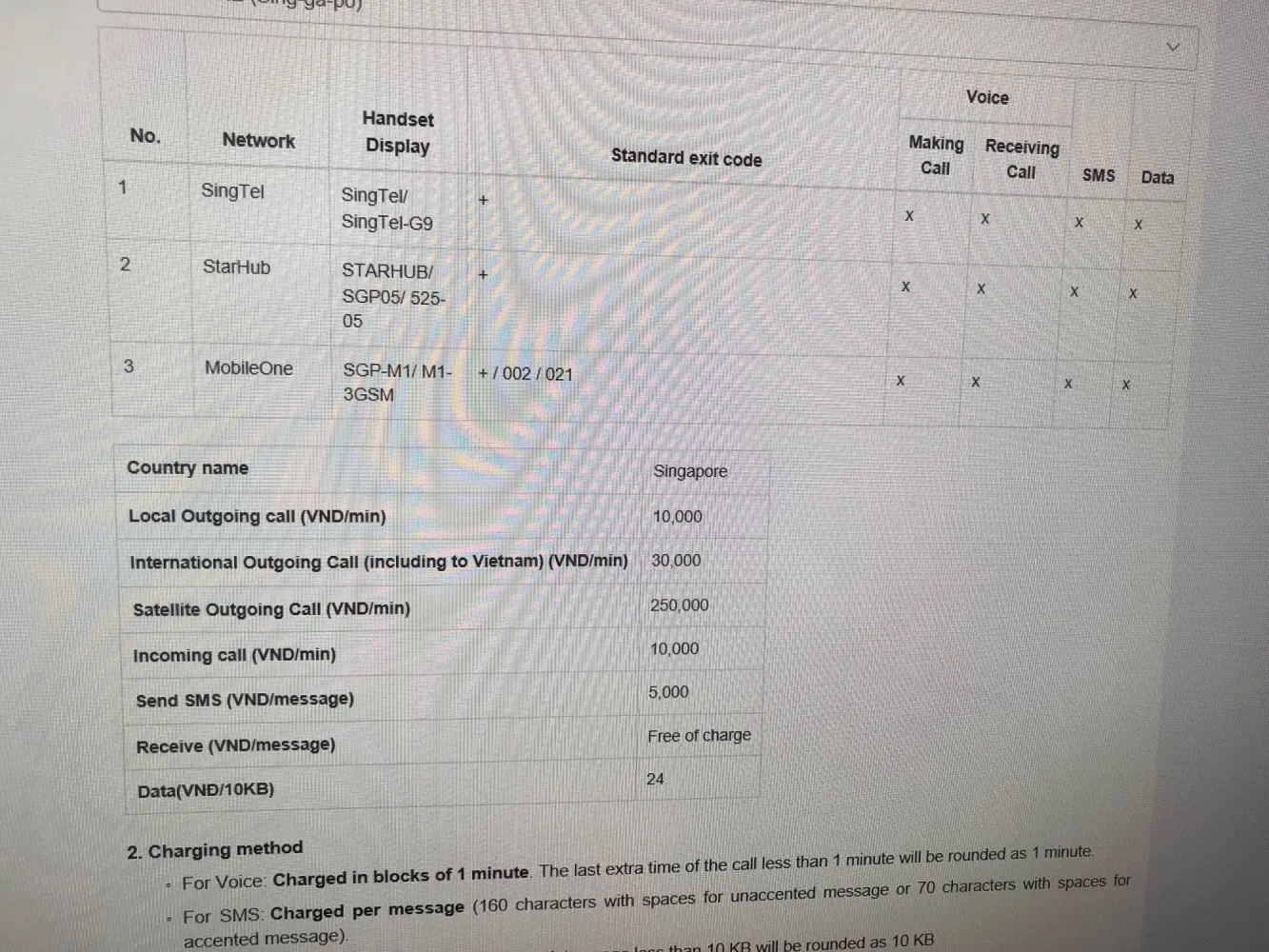 1/ Overseas call in 30 minutes for roaming charge from Singapore to USA: (Vietnam Dong) VND 30.000/minute (quoted per attachment and the link from the operator Mobifone: http://mobifone.vn/wps/portal/public/dich-vu/quoc-te/quoc-te-list/cvqt-thong-thuong/!ut/p/a1/hY9dT4MwFIZ_TS-7HtgH07squjBGNjeJwI0pWGgjtqwr-PctJjNm8eNcnK88ec95SUEyUig2yIZZqRVrx7lYPG92G99bzfwY4sQDSmM_DIH6h51H1v8BGcl9k9wmDSk6ZgWWqtYkq4ajxVZo1bjcu0KeSHEhtU59JzVL0_RxP_WC-SWwjdMAaHS_jB6ubrxtFPwNrMIzAL8EhdFO0-ry03lOVTldur8Nr7nhZtIbtxbWdtcIELzpUtZa8cmgELx3JwSdNpa1rvZlKysEL7ISeOgRHHtdYcu_GlwJia3kFoFzz3HJND7LYcOwGjHVaCZ_ekPokyXZt_Okey3Kxf6uTuw8_wDFJXc6/dl5/d5/L0lDUmlTUSEhL3dHa0FKRnNBLzRKVXBDQSEhL2Vu/