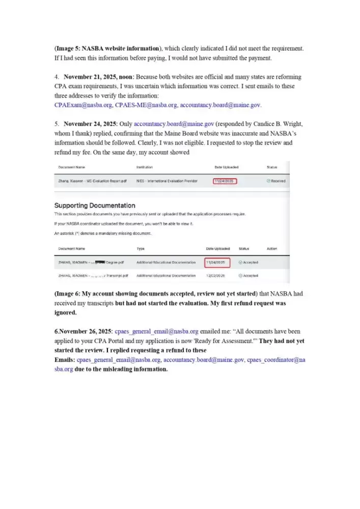 I am an international CPA candidate who applied for exam eligibility in Maine. Misleading information on the Maine Board and NASBA websites caused me to apply under incorrect assumptions. On November 21, 2025, I requested via email to NASBA and Maine CPA coordinator Perceita Beasley to stop the review and refund my $96 fee. Before they even started...