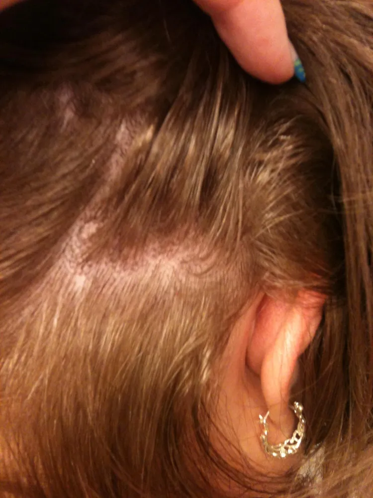 Empire School touched up my roots on 7/15/2010 around 3:20pm. No patch test was done by the student or the (1) teacher who was overseeing several students. The teacher, not the student mixed the product and toner. The roots lifted very fast but came out orange/red. (I did state on several occasions that my hair pulls red but not to the teacher). For an extra charge, Toner was added to deal with the orange/red roots. The toner almost immediately brought the color down to an acceptable light brown. During the initial root lift I noticed the product smelled strong and tingled a bit. The toner appeared to cool things down and my hair was smooth and looked good when I left. My scalp continued to have sensation of burning especially around ears and back of neck. Hair thin and extra un-naturally silky texture to my hair. This burning sensation became unbearable on Monday 7/19/2010 and caused me to call ER at 2:00 am to ask questions to help determine if I needed emergency care. I was unable to see red but by late morning my head was on fire and red. I went to another salon who took the photo's below and applied protein conditioner. I also had to cut /layer my hair about 2.5 inches so as to avoid further strain on scalp by pulling it back into a pony tail. I am not sure if I am going to lose my hair. I only hope that it will grow back. I understand this is a school and that you sign waivers but I do think Empire should take some responsibility as they are not doing patch testing and have really burned me. I am told the product used was Goldwell - 20 volume perm and the toner was a semi perm by Goldwell. Something went terribly wrong. Agonizing pain. I hope it goes away soon!