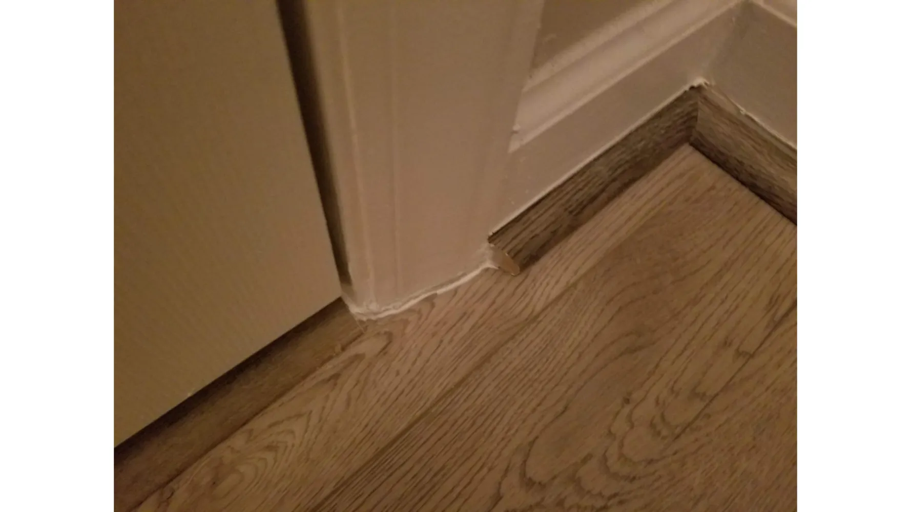 Flooring was not completed. Trim was left off and blue padding is showing all over the place.