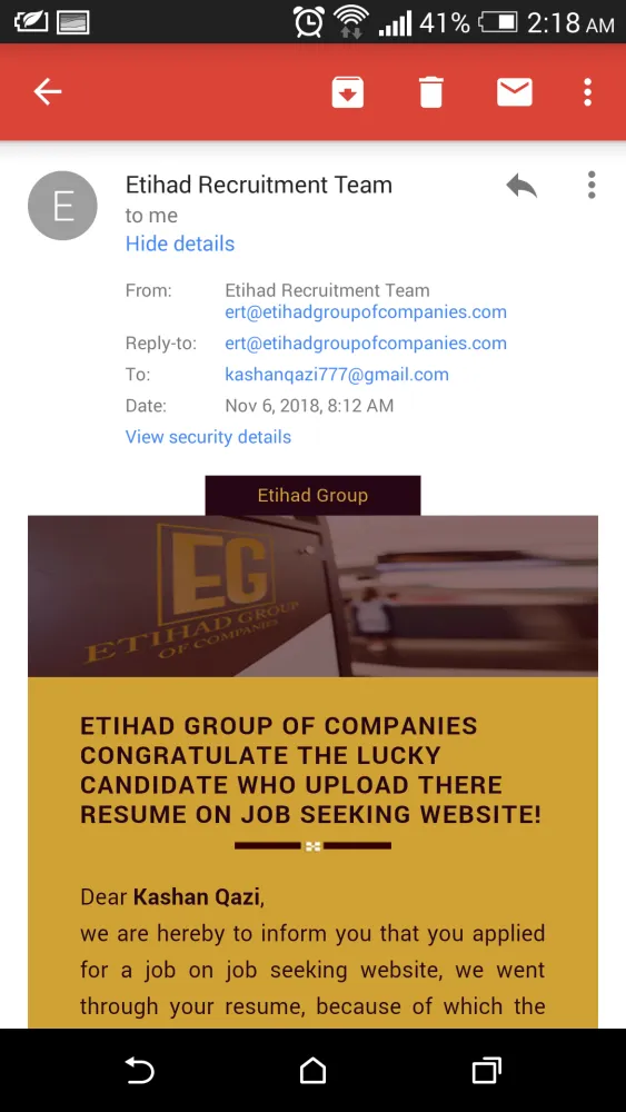 Kindly tell me is it fake or real... I received email and also sms on my cell number about job offer by etihad group of companies. Pictures are attached about details of email address from which I received Email. And I received email from ([protected]@etihadgroupofcompanies.com)
