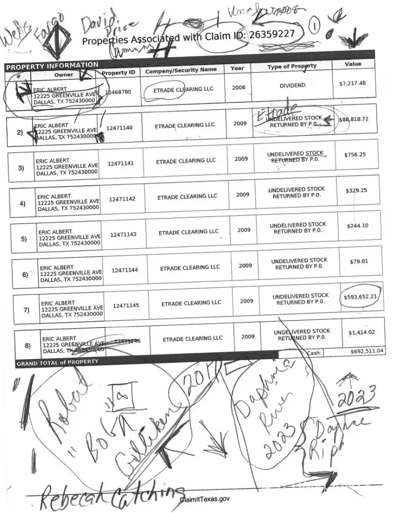 An account was opened under Eric Albert 12225 Greenville Ave Dallas, Tx 75243 in 2005-2009. I never received any statements nor communication from ETrade. The funds were escheated to the Texas Unclaimed Property Division in 2008 and 2009. I have been requesting a copy of my statement accounts from ETrade and can not talk to anyone who will locate any statements or documentation of this account nor the escheatment documents sent to the State Unclaimed Property Division.