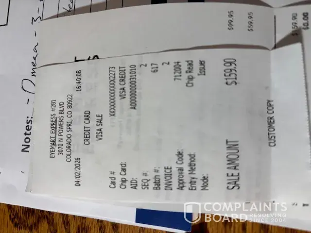 ON 4/2/26 i ordered glasses in person,received a text when they were ready. Went in on 4/6/26 to pickup & I tried them on and it was the wrong prescription.The worker said they would remake them be ready later that day. I went into the store on 04/7 to pickup but she said i owed another $#0 to get the glasses remade so I gladly paid.I asked about sunglasses but said I would purchase later. Woman went full on "karen mode,screaming, yelling "get out of my store you are never allowed in my store again we will mail you your glasses". I am a disabled senior and was horrivied and in tears. I don't have glasses and you have kept my money totaling $189.90 I WANT A REFUND NOW.