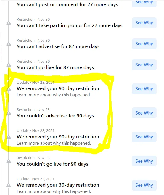 I was banned from fb a while back for something to do with company values blah blah...when i asked for explanation I received zip, zero, crickets. I tried downloading the account info they had on one page and it contained...you got it...zip, zero, nada, about what despicable thing I had done to earn expulsion from their exclusive club. I can only surmise that my being tossed was bc I followed pro-Trump members and occasionally would answer someone's opinion on something with my own opinion...I guess we are not allowed to voice our opinions if they don't correlate with the fb idea of correctness...sad bc I have been on fb for years and years since they first came out of the basement and into the light...shamefully a lot of what used to be our rights are now only available to us in shadow...shame on anyone who allows this and doesn't fight back.