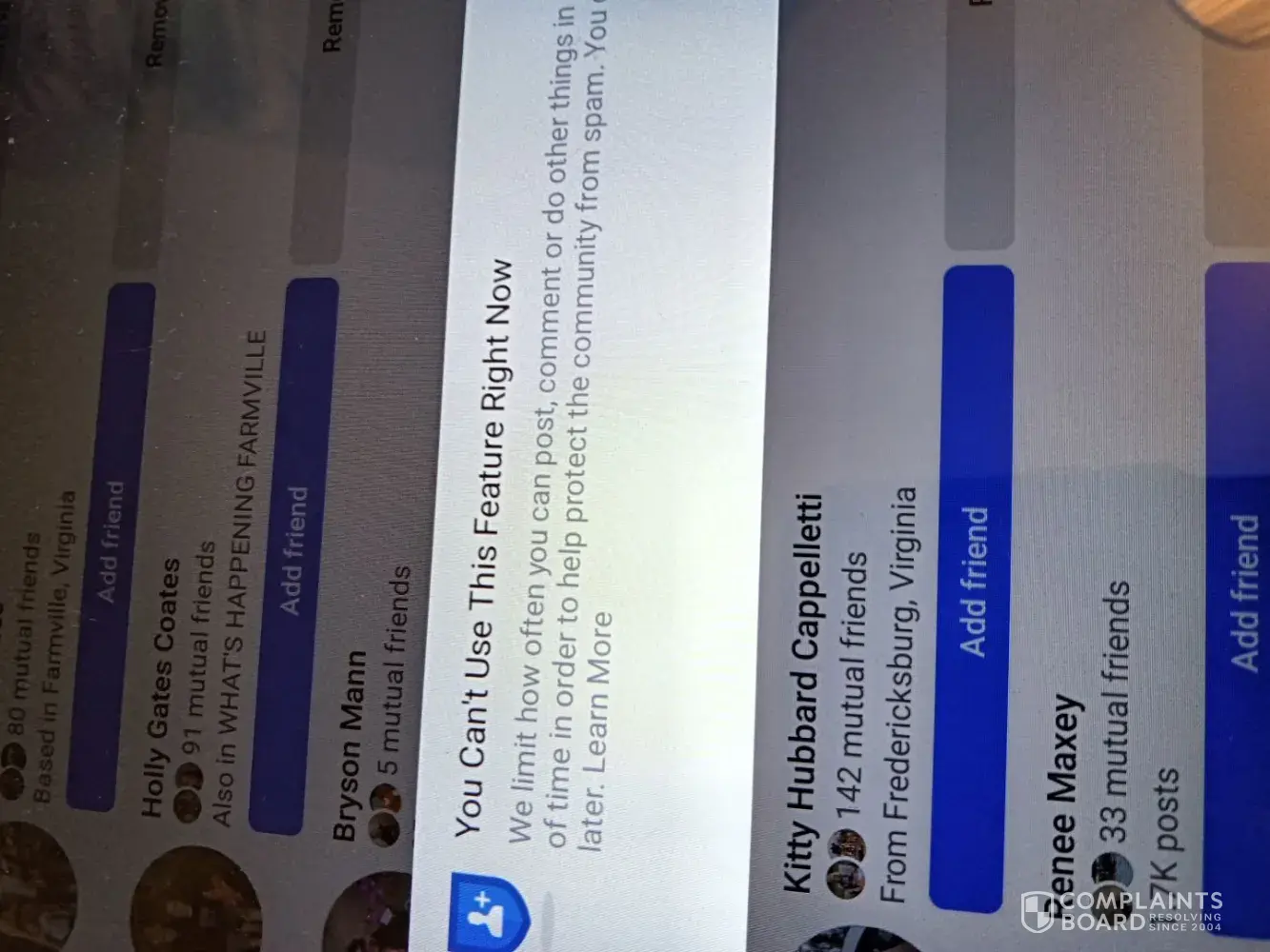 Hi Complaint Board, I am writing to you all about a problem with my Facebook I was unblocked on March 15th there about and I was able to send friend request and everything was going so good and then yesterday I got a message saying you can't use this feature right now and I don't know what I did I haven't sent many requests and I deleted ones that hasn't used Facebook much and I have a green check by my name.