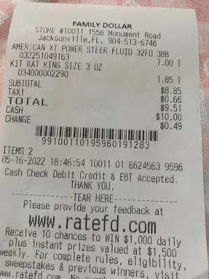Family Dollar Store 10011 1556 Monument Road Jacksonville FL 32225 On 16 May 2022, During My visit to my local family Dollar, I selected two items from the shelf for purchase. The first item was AMERICAN XT POWER STEERING FLUID 32FO ([protected]). The price marked on the shelf for this product was $5.00. When I got to the register, the Power Steering...