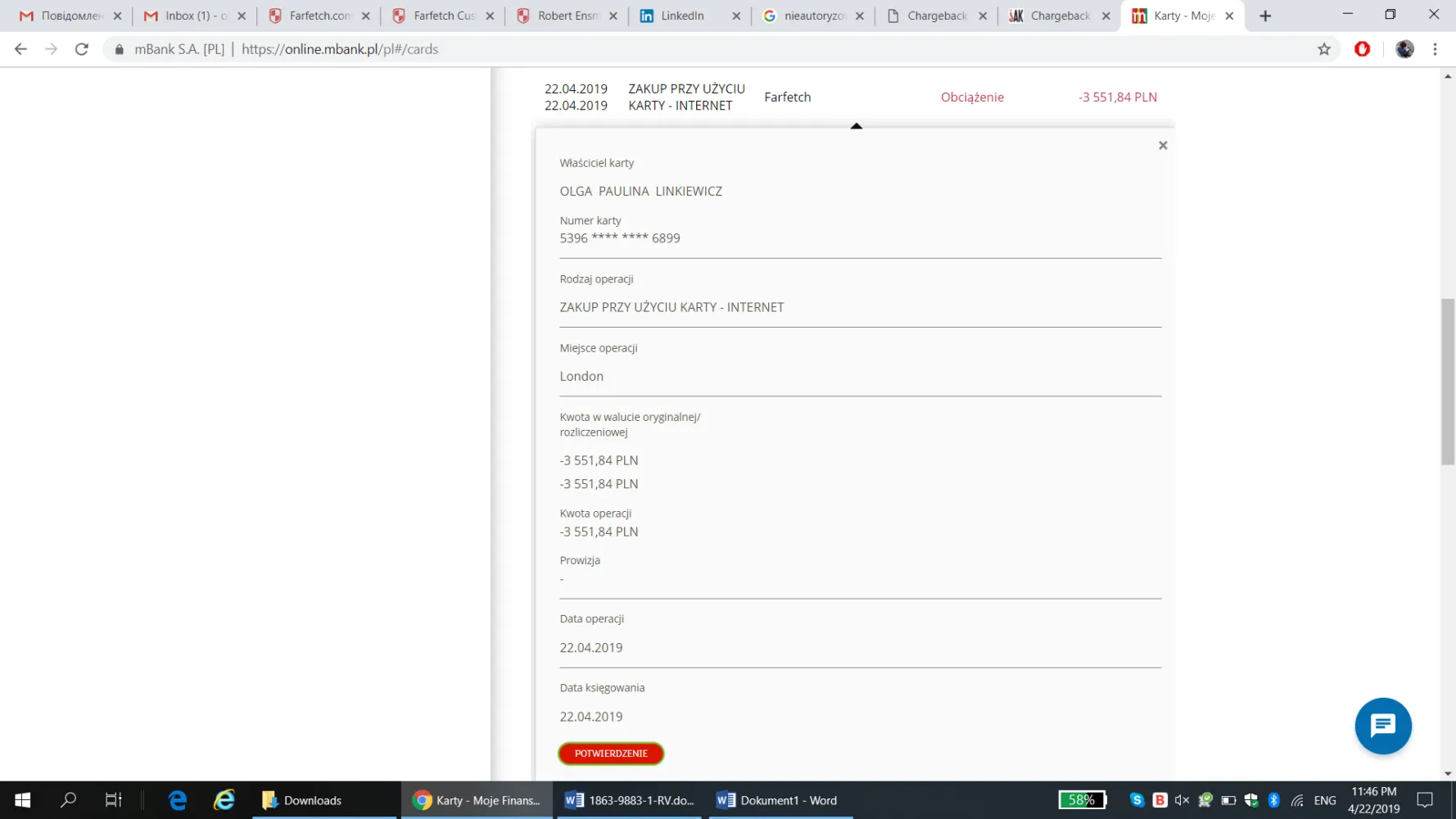 Yesterday (April 22) Farfetch charged my credit card 3817, 93 PLN which is roughly 717 GBP. I've never made any purchases at Farfetch. I suspect my credit card details have been stolen (probably in Lviv, Ukraine, where I was last week). I've already reported incident to the police. Please return the money to my account. Sincerely, Olga Linkiewicz