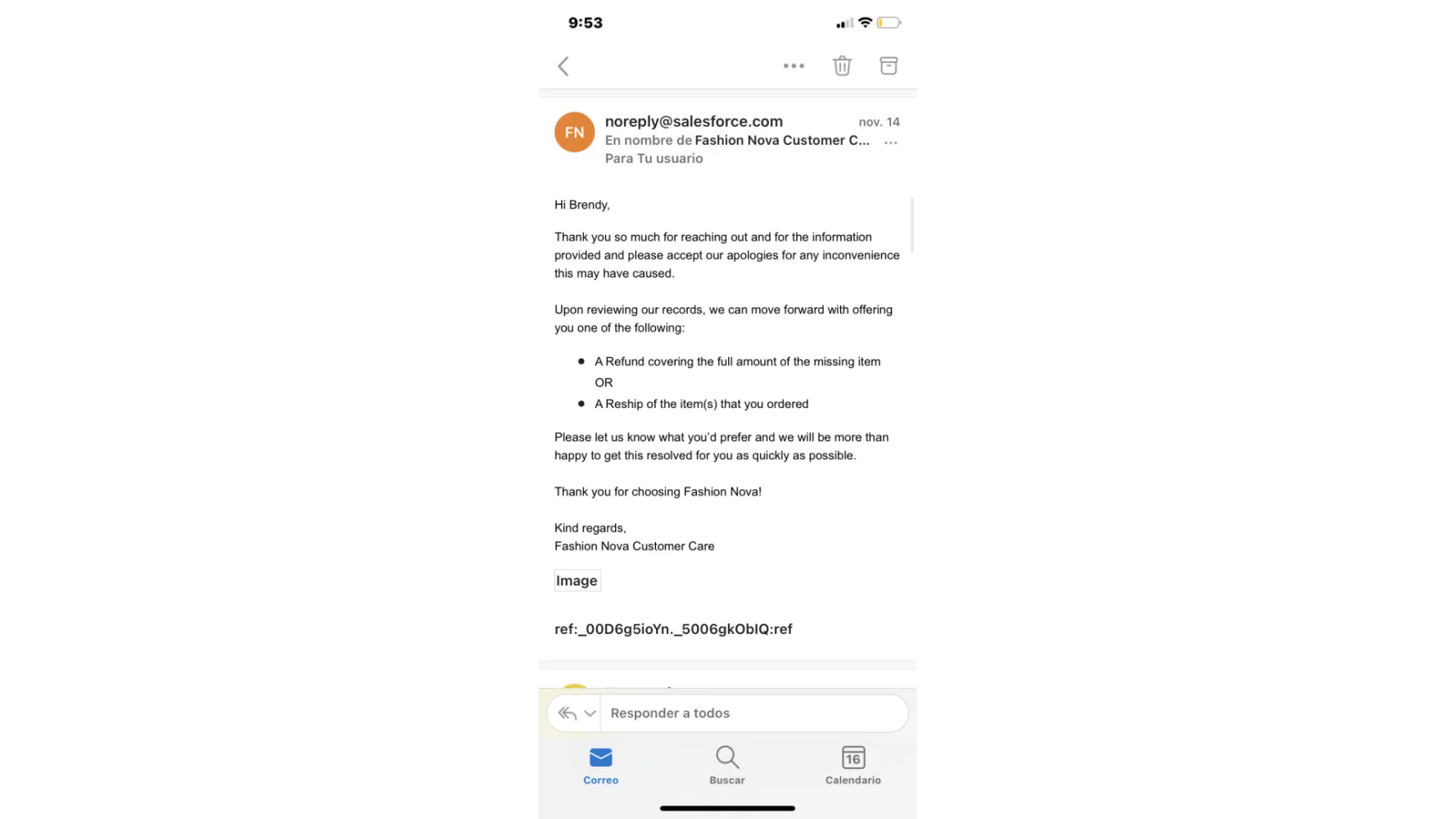 Desired outcome: I’d like to be refunded for my missing package and for fashion nova to have a more customer service friendly process for addressing missing or undelivered packages