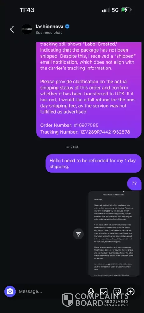 Please provide clarification on the actual shipping status of this order and confirm whether it has been transferred to UPS. If it has not, I would like a full refund for the one-day shipping fee, as the service was not fulfilled as advertised.