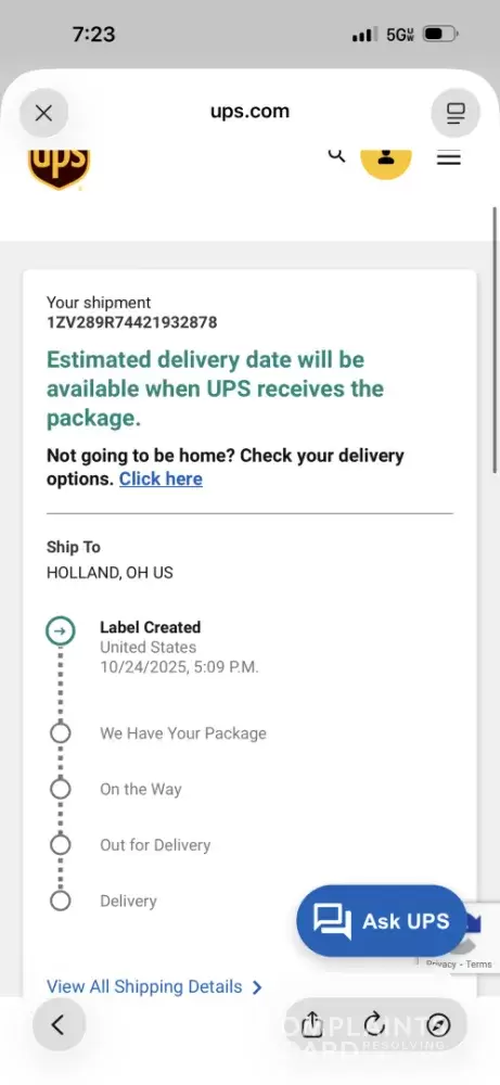 Later that evening, I received an email stating that my package would be delayed. As of Monday, October 27th, the UPS tracking still shows “Label Created,” indicating that the package has not been shipped. Despite this, I received a “shipped” email notification, which does not align with the carrier’s tracking information.