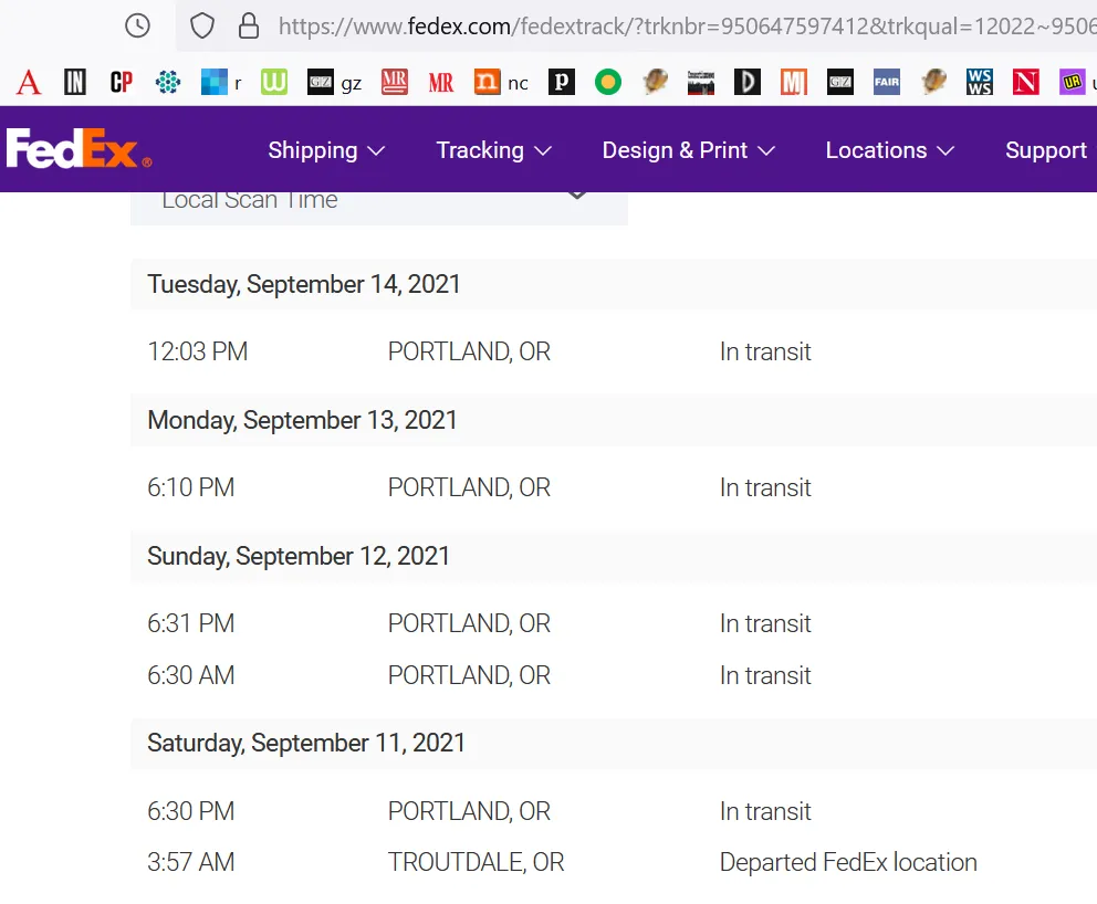 Specifics in my case are as follows. FedEx said my package would arrive at my home in Portland, OR on Thursday, 9/9/2021: "Initially expected: Thursday, 9/9/2021." It did arrive in Portland until 9/11, but FedEx has not delivered. Today, Tuesday the 14th, it still has not been delivered. The worst thing is that FedEx cannot even predict when it MIGHT be delivered. "No scheduled delivery date available at this time." The FedEx tracking number is [protected].