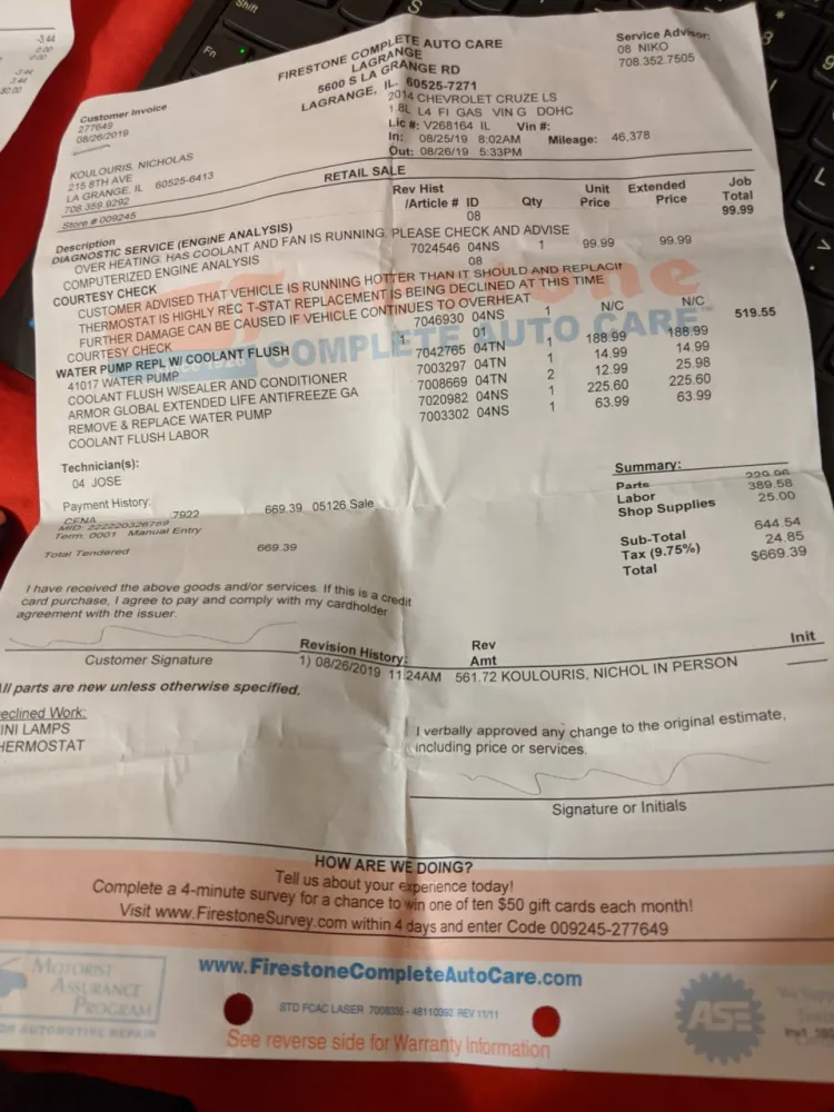 *I should be reimbursed for this expense, which was clearly resultant to the mistakes made by Firestone Tech's, and no fault of my own.