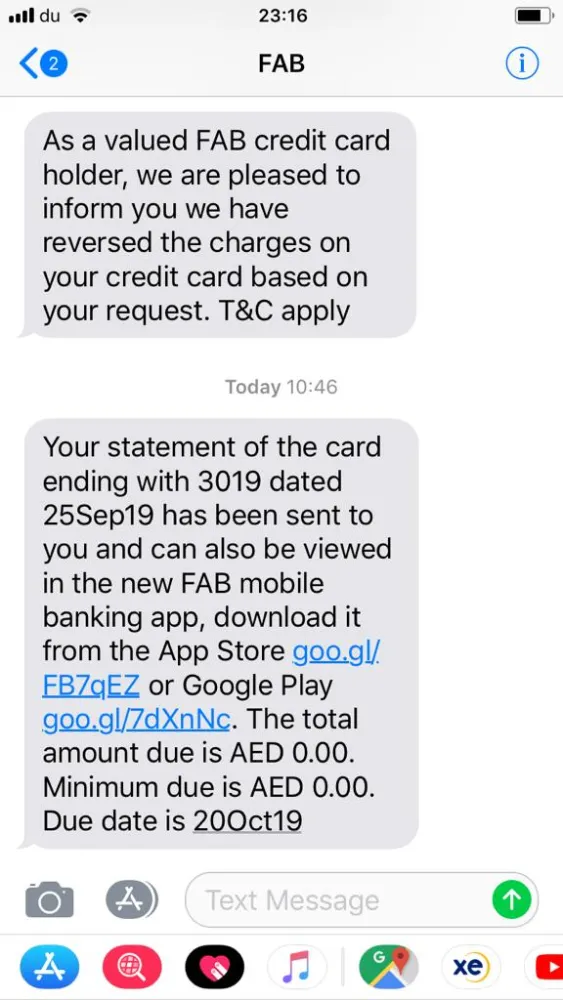 Now I have started receiving messages and statement again from FAB to say i have outstanding amount on the credit card. Also, the Etihad Credit Bureau it is showing that i have outstanding amount on this credit card.