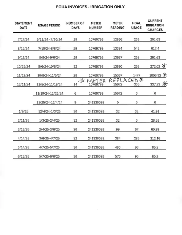 In November 2024 we were billed over $1,800 for irrigation usage . We had never received a bill that high. I have, through documentation, shown FGUA that this bill was in error because once they replaced the meter the bills went back down to normal. We took video of the old meter as it was running and it is clear that there was something wrong with it. We made no changes to our sprinkler system that would result in a change in the amount of water being used. We believe it is clear that the meter that showed a usage resulting in over $1,800 in usage was broken. Since FGUA replaced the meter, there have not been any bills anywhere near as high as $1,800. I have been trying to get this resolved since last year and have not had anyone take me seriously. They said they bench tested the old meter but when I asked for a detailed explanation as to the results of the test, I have gotten no response for months.